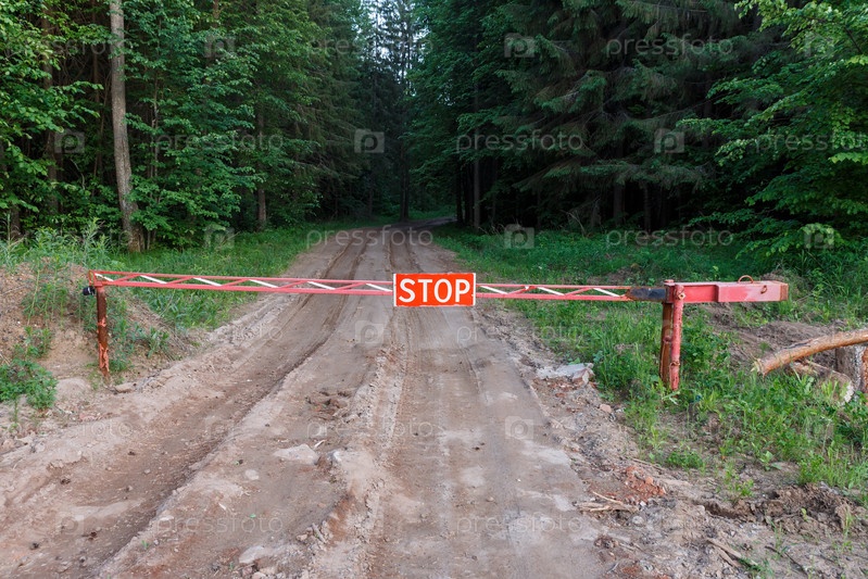Знак стоп на лесной дороге. Закрытый шлагбаум. Вход в лес запрещен