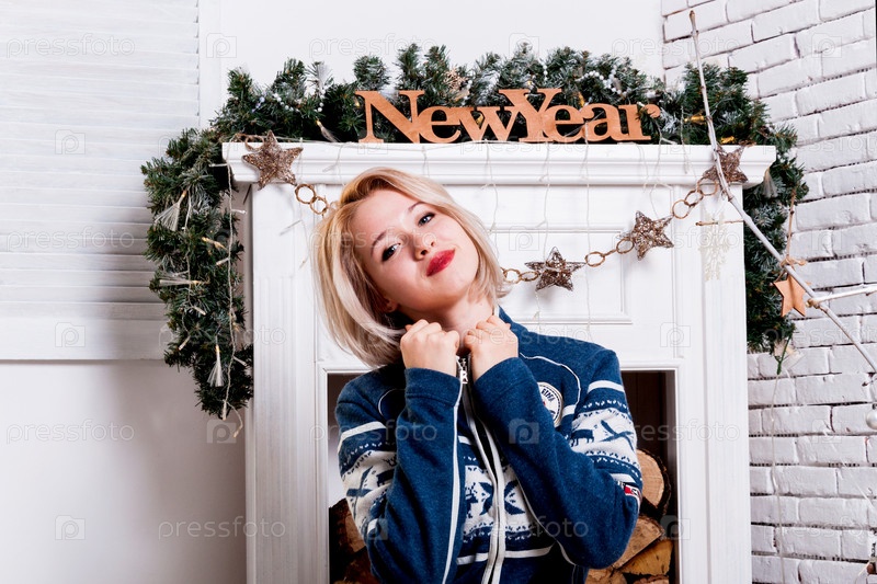 Блондинка в свитере сидит у камина в новогодних украшениях