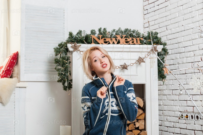 Блондинка в свитере сидит у камина в новогодних украшениях