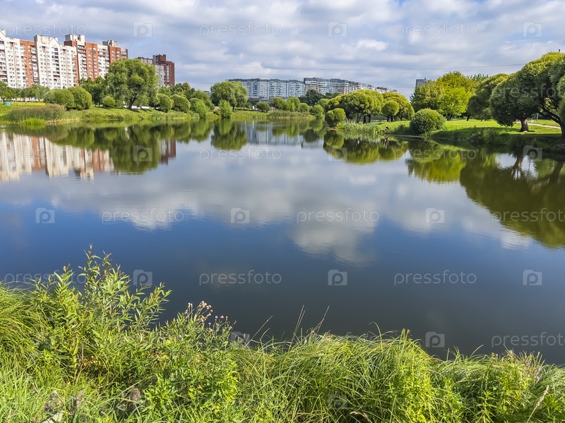 Санкт-Петербург, Россия, 13 августа 2022 г. Многоэтажные современные жилые дома у пруда