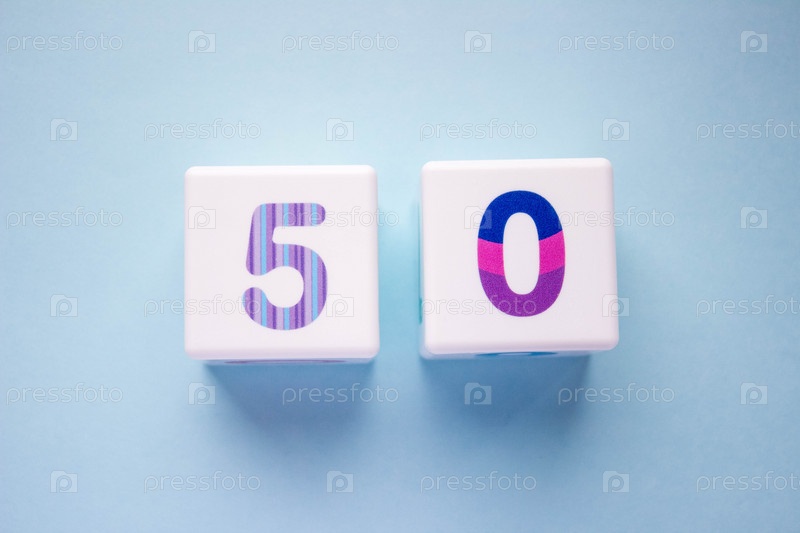 Крупный план белых пластиковых кубиков с красочным номером 50 на синем фоне. Объект в центре фотографии