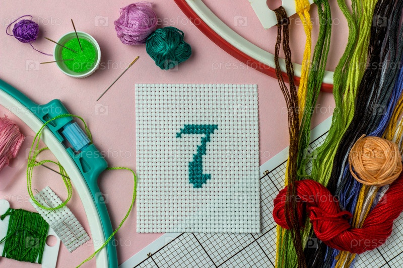 Зеленая вышивка крестиком №7 в окружении аксессуаров для вышивки: нитки мулен разных цветов, иголки, схема, пяльцы. Ручной работы