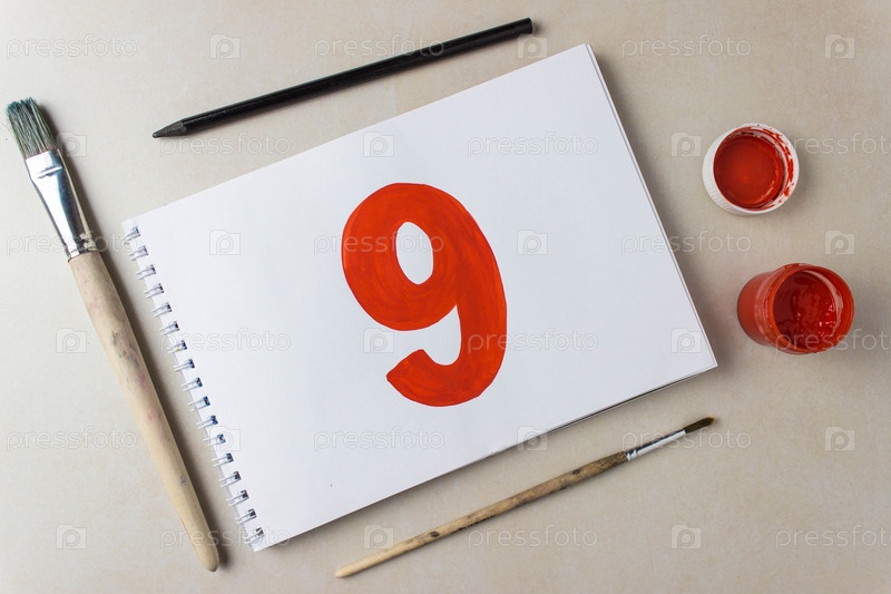 Красный рисунок номер девять на белом альбомном листе. Рядом кисти и баночка с краской