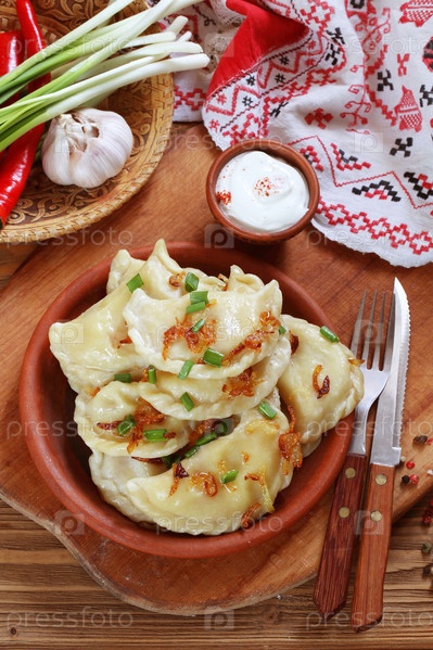 Вареники с картофелем и сметаной на деревянном фоне