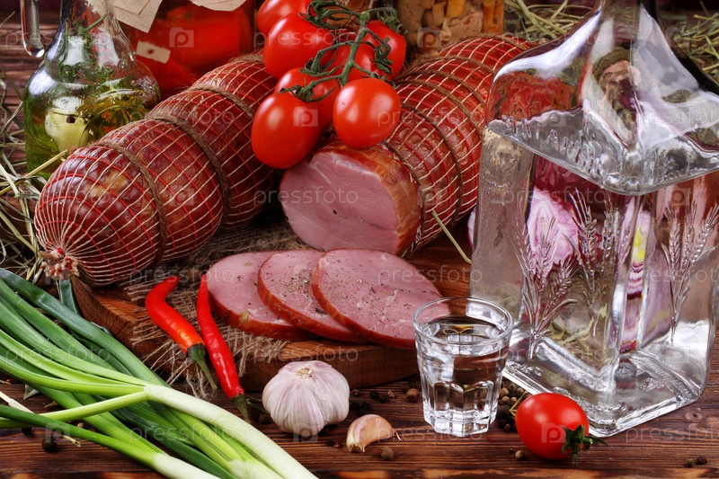Натюрморт с колбасой на деревянном фоне