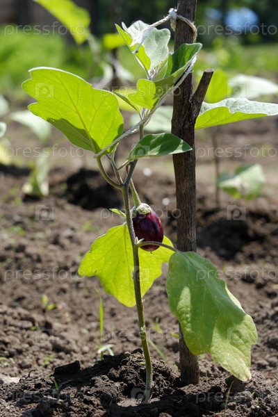 Молодое растение баклажана на заднем дворе, привязанное к палочке с созревающим баклажаном