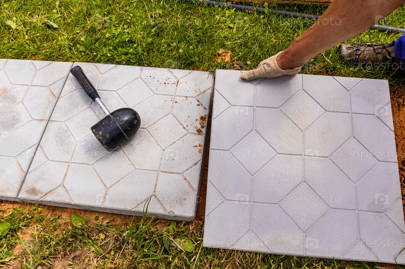 Процесс укладки плитки на садовой дорожке профессиональным рабочим в белых строительных перчатках. дачное строительство, садовый дизайн
