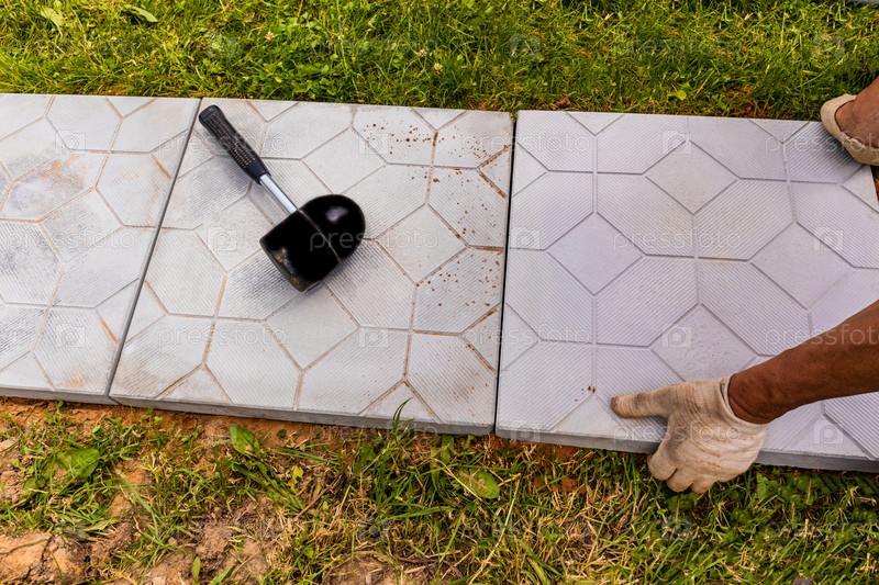 Профессиональный рабочий укладывает каменные плиты на территории загородного дома. благоустройство и благоустройство придомовой территории