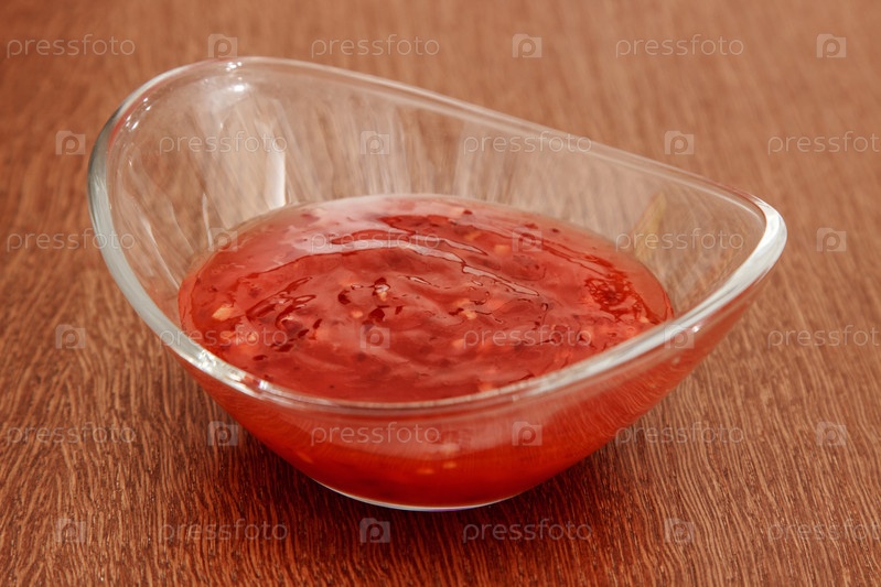 Стеклянная тарелка с острым соусом чили на деревянном столе. закрытый крупным планом