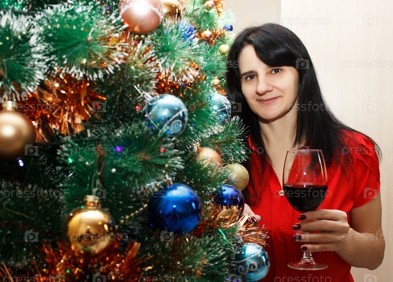 Молодая брюнетка улыбается, женщина с бокалом шампанского возле елки дома