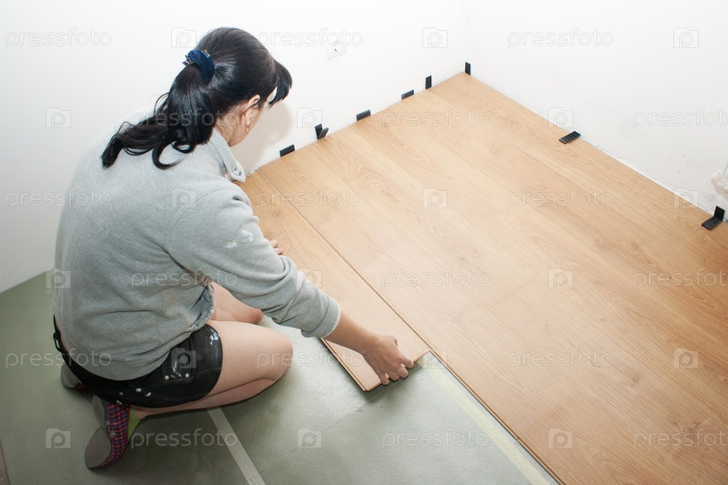 Красивая женщина укладывает ламинат