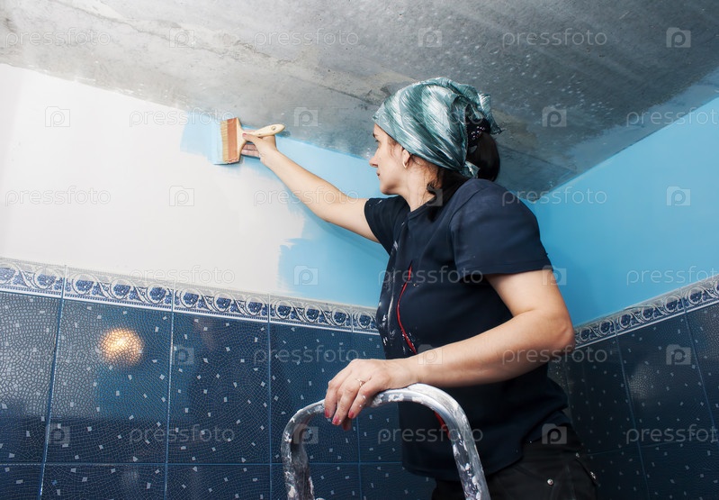 Молодая красивая женщина красит стену