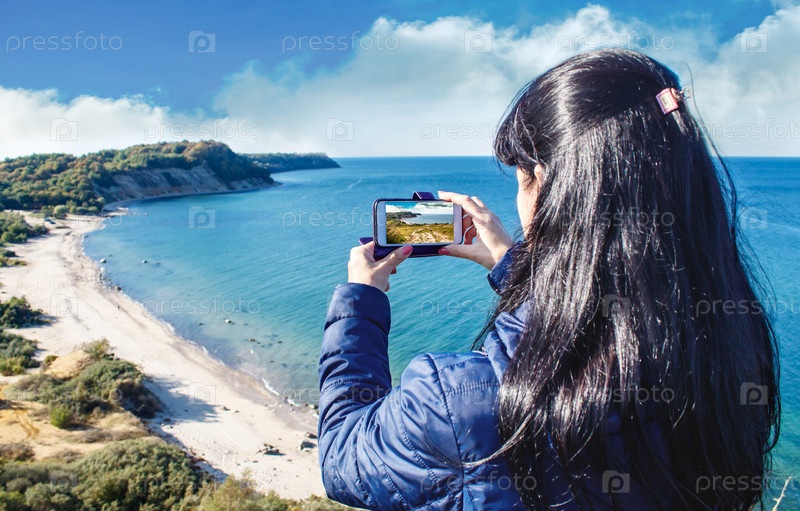 Женщина в синей куртке фотографирует морской пейзаж с помощью смартфона