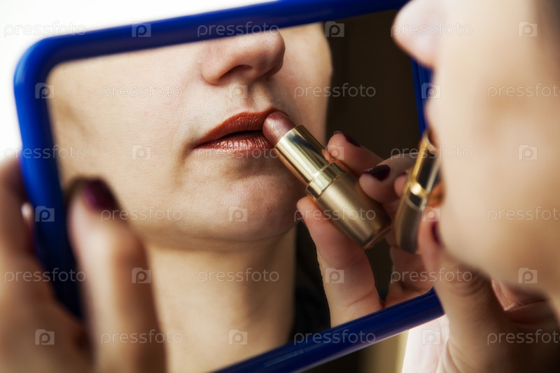Женщина красит губы помадой перед зеркалом