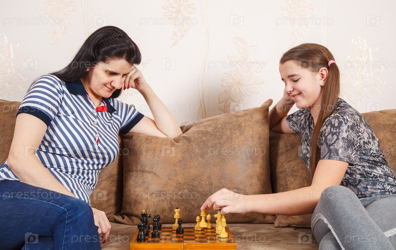 Мама и дочка играют в шахматы дома