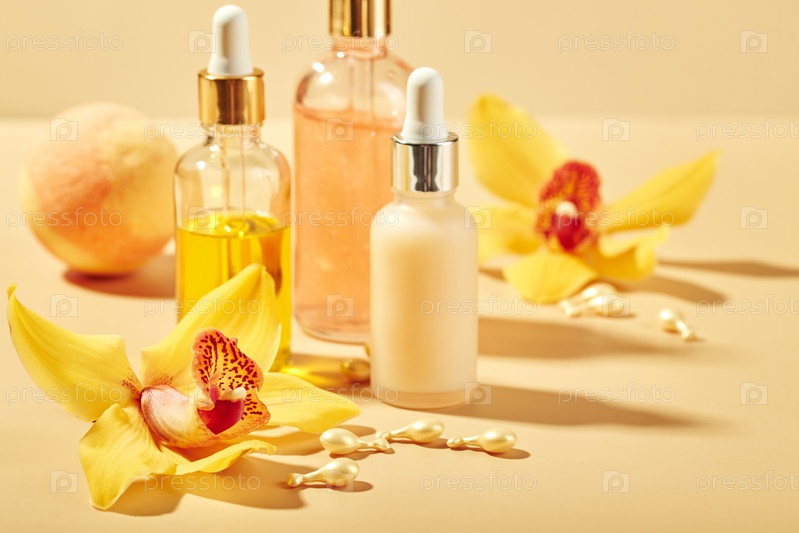 Косметические средства по уходу в стеклянных флаконах с цветами орхидеи - сыворотки, крем, гель, масла. Концепция ухода за лицом и телом, велнес и спа, тропический отдых