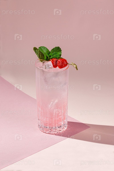 Холодный алкогольный или безалкогольный коктейль на пастельном фоне. Жесткий свет, глубокая тень
