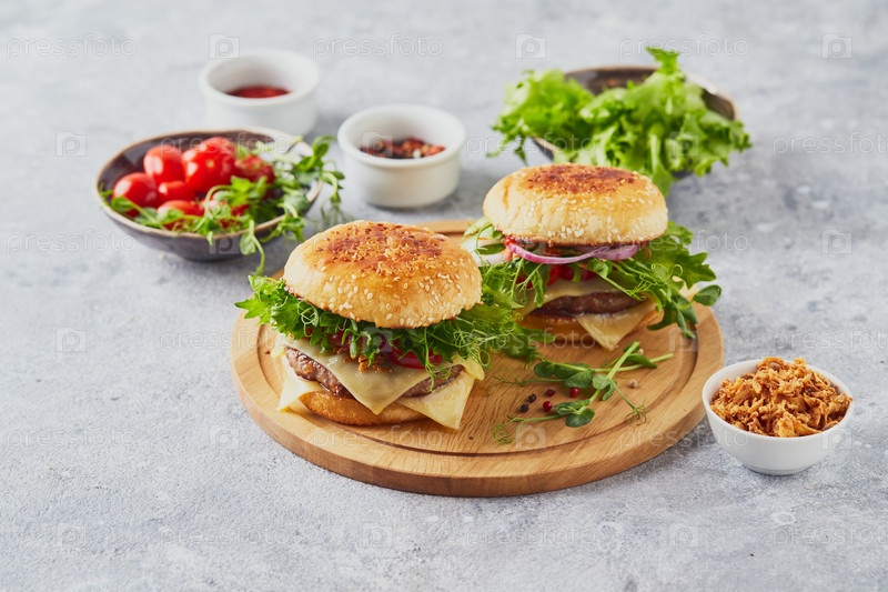 Два гамбургера с котлетой из телятины и зеленью на деревянной разделочной доске
