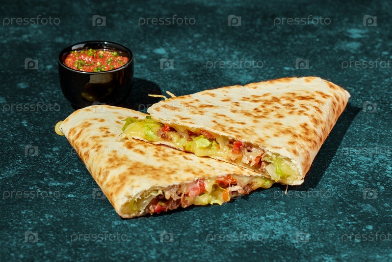 Кесадилья с курицей, сыром, овощами и зеленью и соусом