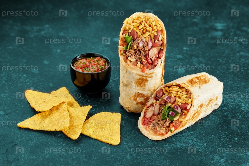 Традиционный мексиканский буррито с говядиной, чипсами начос и соусом сальса
