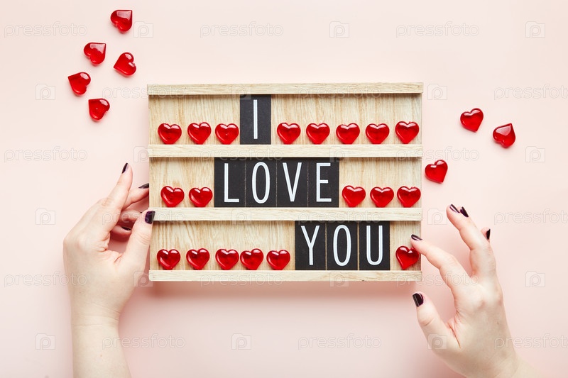 Я тебя люблю. Текст на доске с красными сердцами и женскими руками на розовом фоне. Вид сверху. Фон для дня святого Валентина