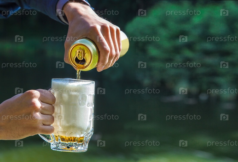 Мужчина наливает пиво из банки в кружку