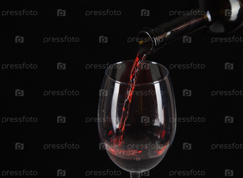 Красное вино наливается в стакан крупным планом на черном фоне