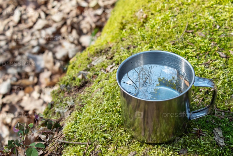 Металлическая чашка с водой на бревне в лесу
