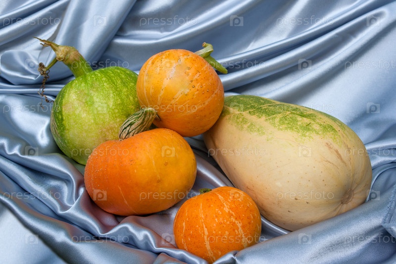 Свежие апельсиновые и зеленые тыквы и кабачки на светлом фоне