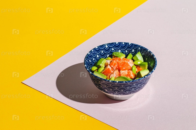 Поке-боул с рисом, авокадо, бобами эдамаме и копченым лососем. Жесткий свет, глубокая тень