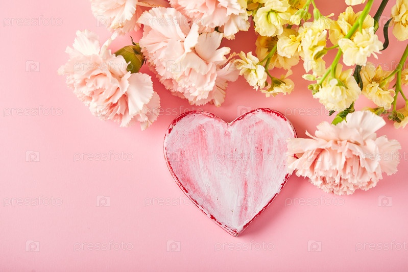 Букет из розовых гвоздик и желтой маттиолы и декоративное сердце. Концепция дизайна праздничного приветствия с букетом гвоздик на розовом фоне