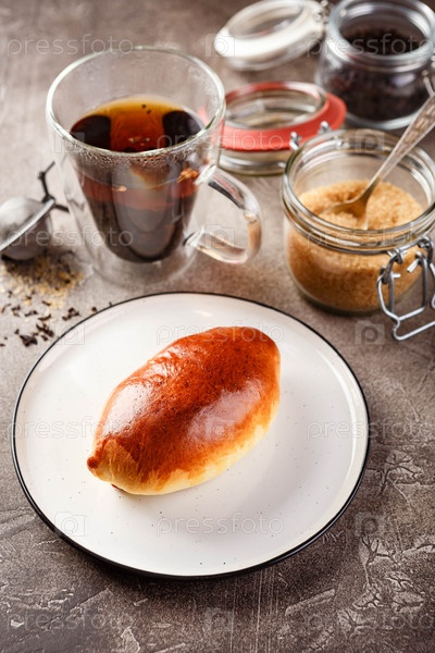 Сладкие пироги или булочки из дрожжевого теста на блюде и стакане чая