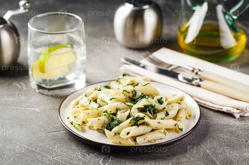 Обеденный стол с тарелкой пасты пенне со шпинатом, комплексное меню для здорового обеда в ресторане, бизнес-ланч