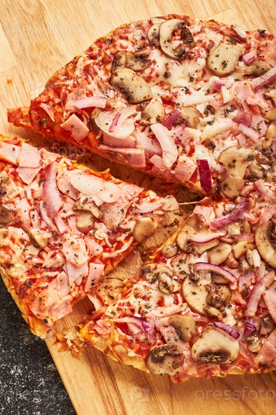 Фаст-фуд, Запеченная замороженная пицца с ветчиной, грибами и сыром на густом тесте. Готовы съесть. Флэтлей