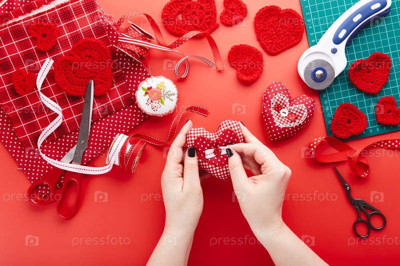 Женские руки поправляют ленту на сшитом сердце. Вид сверху на стол с клубками пряжи, вязаными и сшитыми сердечками, тканью и лентами. День святого валентина подарки ручной работы фон