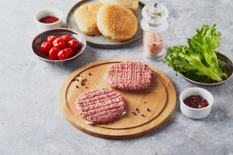 Котлеты из стейка из сырой телятины на деревянной разделочной доске