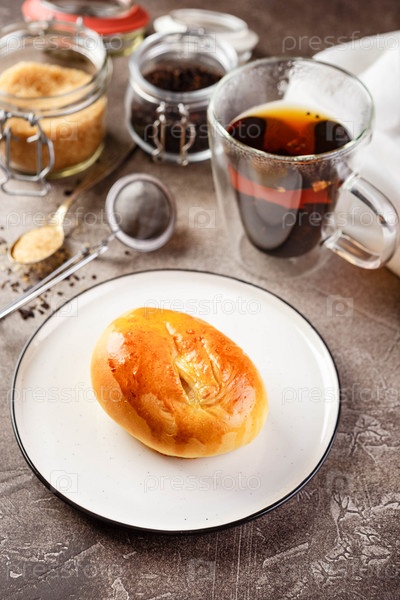 Пирог со сладкой или соленой начинкой из теста на блюде и чашка чая
