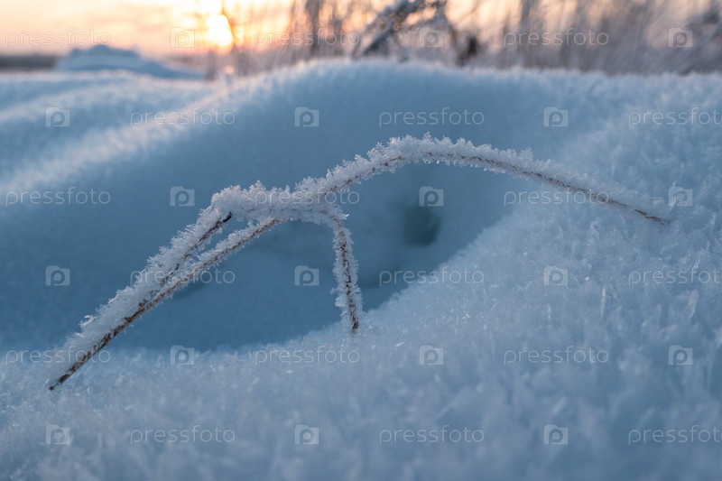 Замерзшая трава, стоящая в снегу во время заката зимой, естественный фон