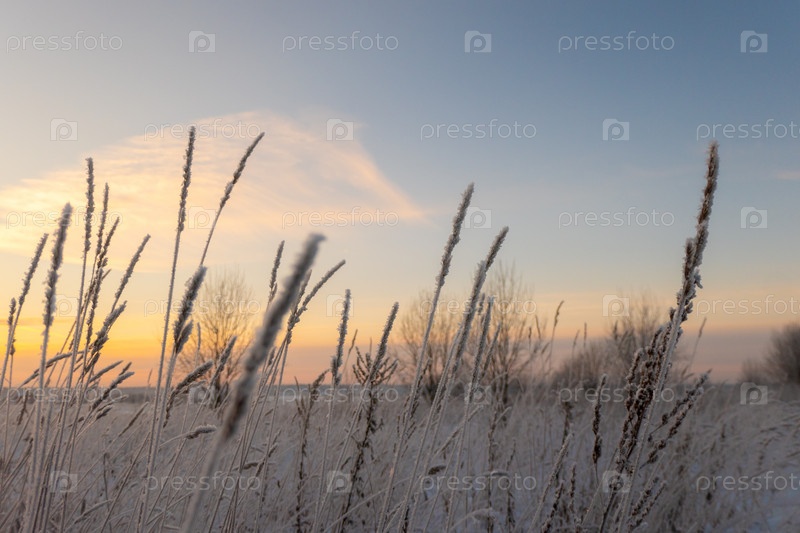 Избирательный фокус небольшого сухого травяного колоса, покрытого снегом зимой на закате на размытом фоне