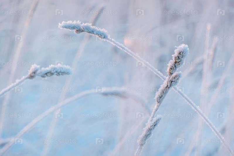 Избирательный фокус маленького сухого колосья травы, покрытого снегом зимой в дневное время на размытом фоне