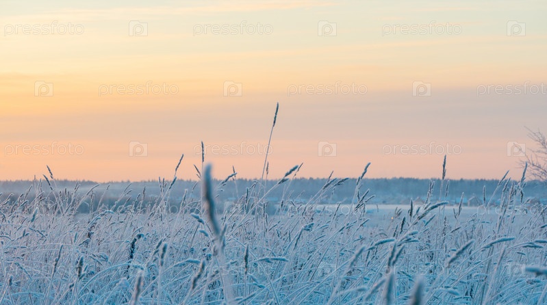 Избирательный фокус маленького сухого колосья травы, покрытого снегом зимой в дневное время на размытом фоне