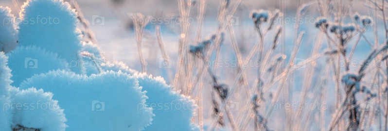 Трава в больших сугробах после снегопадов и метелей, зимний сезон с холодами и большим количеством осадков в виде снега покрывают траву и сухие растения