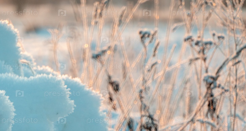 Трава в больших сугробах после снегопадов и метелей, зимний сезон с холодами и большим количеством осадков в виде снега покрывают траву и сухие растения