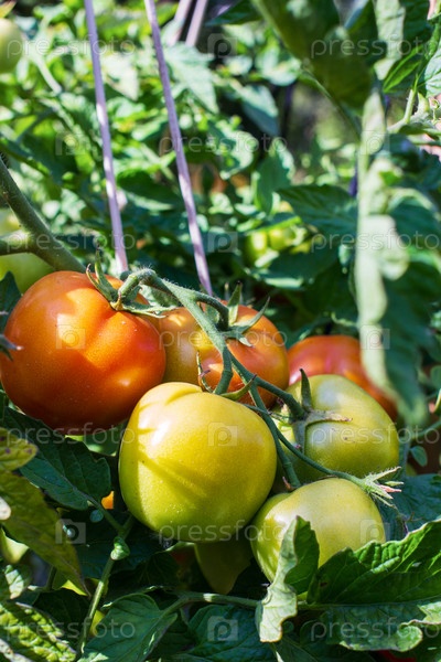 Помидоры созревают на ветке красные и зеленые