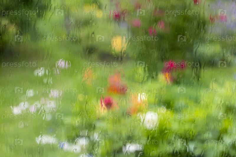 Размытый фон. Солнечный летний сад с зеленой травой, красивым солнечным светом и размытыми каплями воды