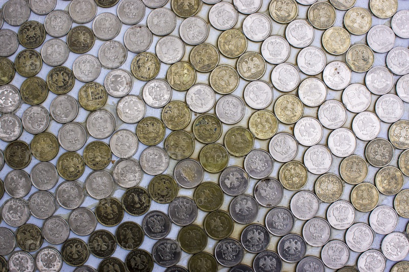 Текстура русских монет. Полный кадр монет, расположенных на столе