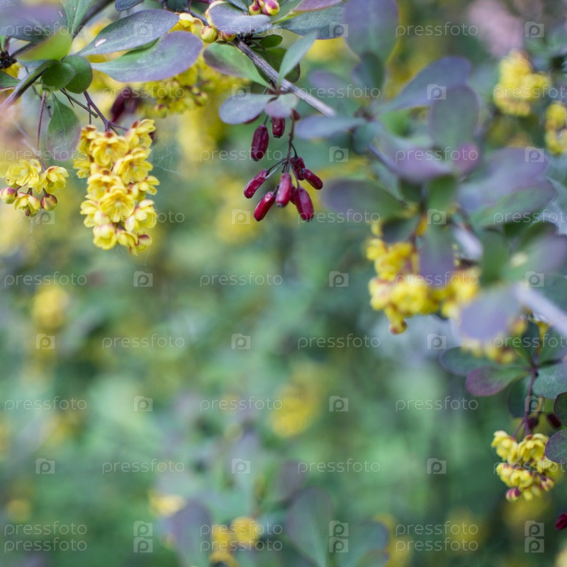 Мягкий фокус красивых весенних цветов Berberis thunbergii Atropurpurea цветёт. Макрос крошечных желтых цветов барбариса на фоне элегантных фиолетовых листьев боке. Концепция природы для дизайна
