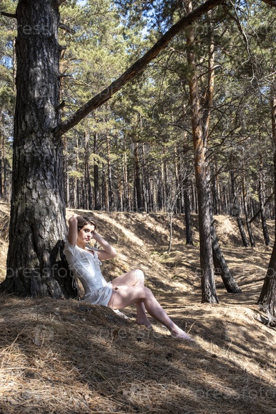 Красивая молодая девушка позирует в весеннем сосновом лесу