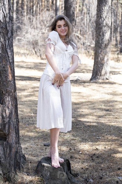 Красивая молодая девушка позирует в весеннем сосновом лесу