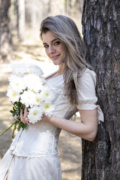 Красивая молодая девушка позирует в весеннем сосновом лесу